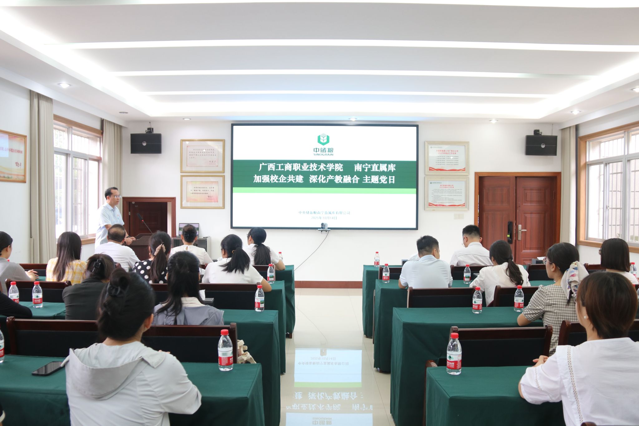 在第 45 个世界粮食日来临之际,为深入贯彻落实习近平总书记关于国家粮食安全的重要论述,切实践行“为党育人、为国育才的初心使命”,2025 年 10 月 14 日上午,粮油与管理学院党总支赴中央储备粮南宁直属库有限公司开展了 “校企协同育匠心 产教融合兴粮业” 主题党日活动。