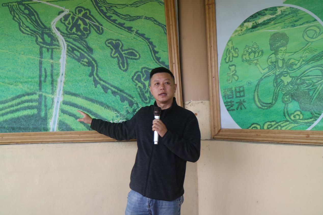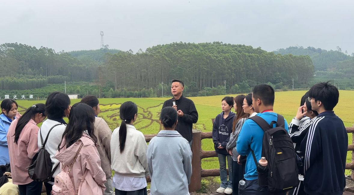 实践队抵达大陆村后,受到广西大陆村农旅发展有限公司总经理何远峰的热情接待。何远峰为师生揭开“艺术稻田”的神秘面纱:以宾阳特色香米为“画布”、不同颜色水稻为“颜料”创作的稻田画,已成为展示本土文化的亮丽名片。“我们有责任、有义务把稻田艺术打造成品牌,传播出去。”何远峰的介绍,让同学们对“传统农耕+现代艺术+文化传承”的模式兴趣浓厚。他进一步剖析一幅成功稻田艺术作品背后的三大支柱——创意设计、执行技术与种源保障,并强调优质种源既是稻田艺术呈现效果的基础,更是粮食安全的核心与基石,使同学们对“藏粮于地、藏粮于技”有了直观认识。