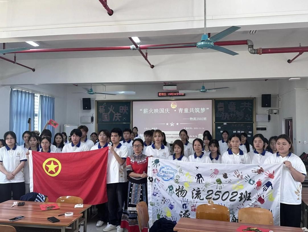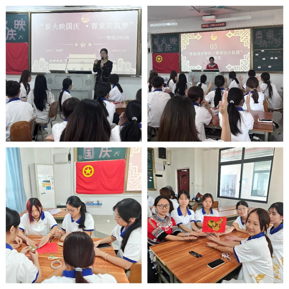14日下午,团支部于武鸣校区A3-301教室开展主题班会,活动围绕五大环节展开:一是主题介绍,明确“薪火传情、共筑家国梦”的核心目标;二是五史宣讲,邀请教师党员与优秀团员讲解“五史”,深化对国家发展艰辛历程与辉煌成就的认知;三是党史知识竞答,团员们踊跃参与、沉着应答,在比拼中巩固对党的理论与国家发展历程的理解;四是创意创作,全体团员协作完成“一叶绘山河”落叶拼贴中国地图,用色彩与创意勾勒祖国疆域,强化国家认同感与民族自豪感;五是合影留念,定格团员们同心向国的青春瞬间。