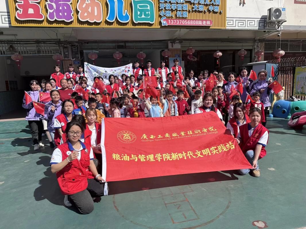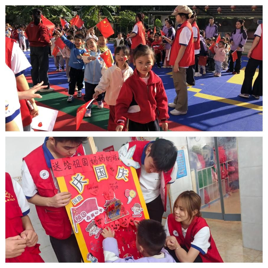 本次活动分为幼儿园实践关爱、校园理论学习两大部分。14日上午,团支部成员先行前往武鸣五海幼儿园开展实践活动。活动中,同学们化身“爱国启蒙导师”,与小朋友齐声合唱《我和我的祖国》,悠扬歌声传递爱国情怀;随后指导小朋友绘制国庆主题作品,完成后共同拍摄“我与祖国同框”照片,用灿烂笑容向祖国告白;此外,还协助小朋友书写暖心寄语,粘贴在展示板上,让爱国情感在儿童心中萌芽;实践最后,全体人员合影留念,定格青童携手共筑爱国梦的温馨画面。
