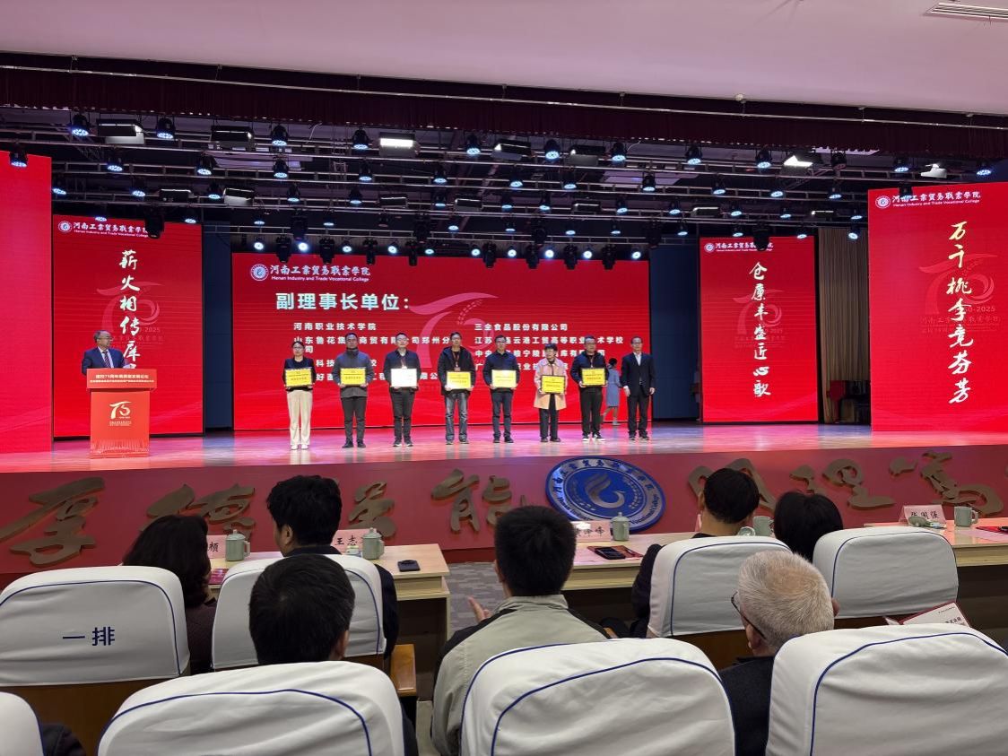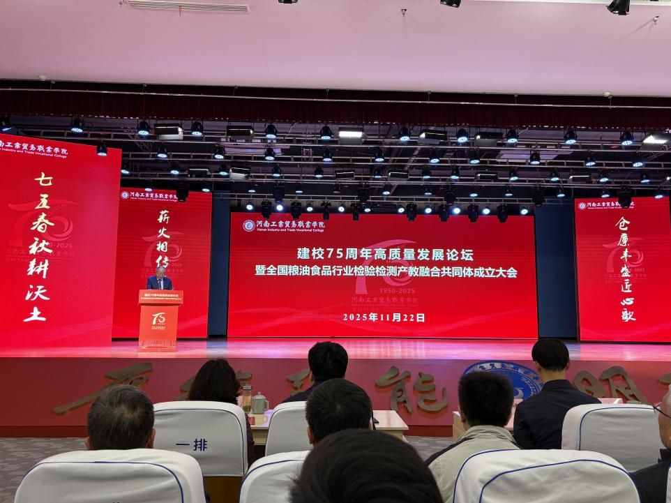 2025年11月21日至22日,河南工业贸易职业学院迎来建校75周年重要活动——“建校75周年高质量发展论坛暨全国粮油食品行业检验检测产教融合共同体成立大会”。本次大会由中国检验认证集团检验有限公司、河南工业大学、河南工业贸易职业学院联合主办,以“融合促进共赢——全国粮油食品行业检验检测产教融合共同体”为主题,汇聚行业智慧,共绘粮油食品检验检测领域产教融合新蓝图。我校当选全国粮油食品行业检验检测产教融合共同体副理事长单位,粮油与管理学院副院长刘洋、教师代表李杭峰参会。