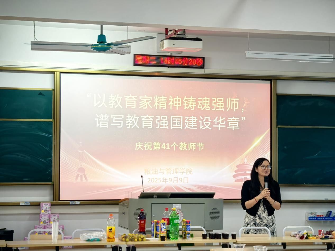 为庆祝第41个教师节,弘扬教育家精神,激励广大教师担当教育强国建设使命,2025年9月9日下午,粮油与管理学院在武鸣校区A2-401教室举办“以教育家精神铸魂强师,谱写教育强国建设华章”为主题的庆祝第41个教师节主题活动。活动由粮油与管理学院工会委员温菊桃、范金明主持,全体教师参加了此次活动。