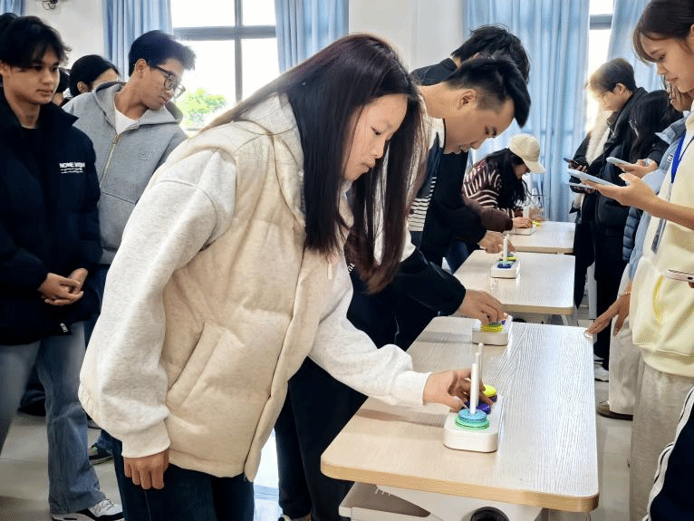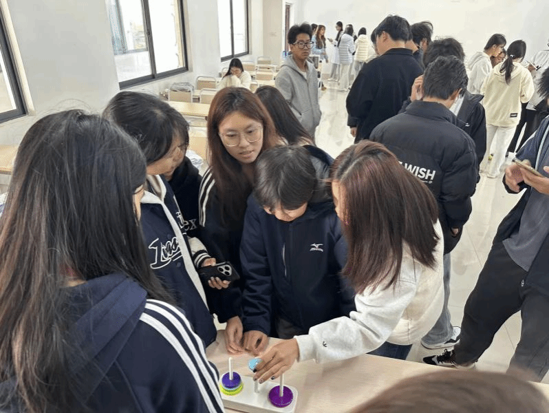 活动伊始,线上知识竞赛率先点燃战火。竞赛题库紧密围绕大学生日常心理常识、压力管理技巧及校园生活情景应对设置,同学们在限时作答中巩固了心理健康知识,展现了良好的心理认知基础。随后,现场汉诺塔团队挑战将活动推向高潮。各参赛小队在面对5至6层塔的复杂任务时,迅速制定策略、明确分工,在有限的练习后便投入紧张的计时赛。挪动塔片时的小心翼翼、步骤出错时的及时调整、团队内部的低声沟通与彼此鼓励,充分考验并锻炼了同学们的专注力、问题解决能力和在压力下的团队协作精神。整个赛场既充满竞技的紧张感,又洋溢着合作的暖流。