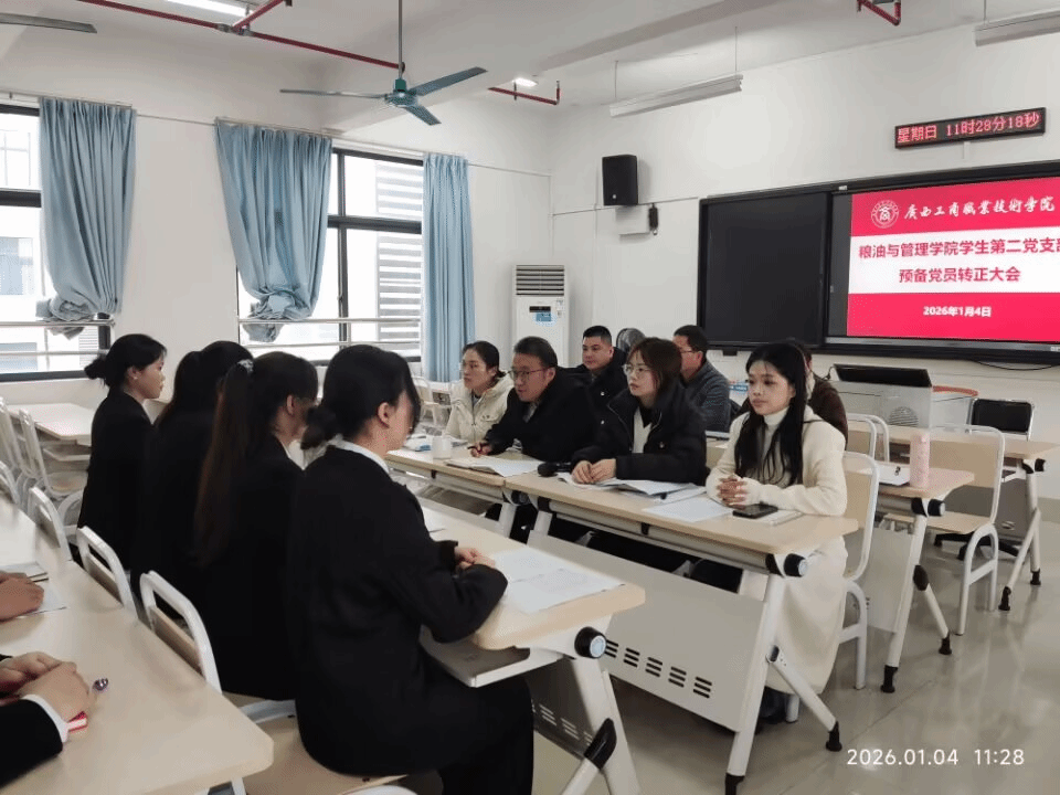 2026年1月4日,粮油与管理学院学生第二党支部在武鸣校区A2-405隆重召开预备党员转正大会,会议严格按照组织程序,对12名预备期满的预备党员进行转正审议。2025年12月31日晚,国家主席习近平通过中央广播电视总台和互联网,发表了二〇二六年新年贺词,为深入学习领会贺词精神,凝聚青春奋进力量,支部开展“学习新年贺词 汲取奋进力量”主题党日活动。支部全体教师党员、学生党员积极参与。