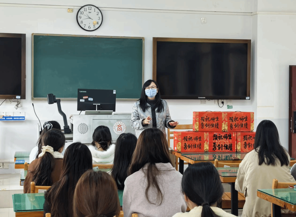 图为 王娟书记在教室前排讲话,鼓励师生“坚定信心,稳扎稳打”